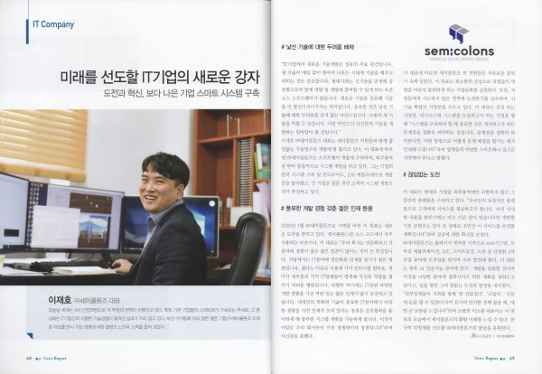 오늘날 세계는 4차 상업혁명으로 각 부문의 변혁이 이뤄지고 있다. 특히 기존 기업등의 스마트화가 가속되는 추세로, 그 중심에는 IT기업간의 치열한 기술경쟁이 일궈낸 성과가 자리 잡고 있다. 부산 구서동에 자리 잡은 젊은 기업 (주)세미콜론즈 이재호 대표를 만나 기업 경영에 대한 열정과 노하우, 노력을 들어 보았다.
